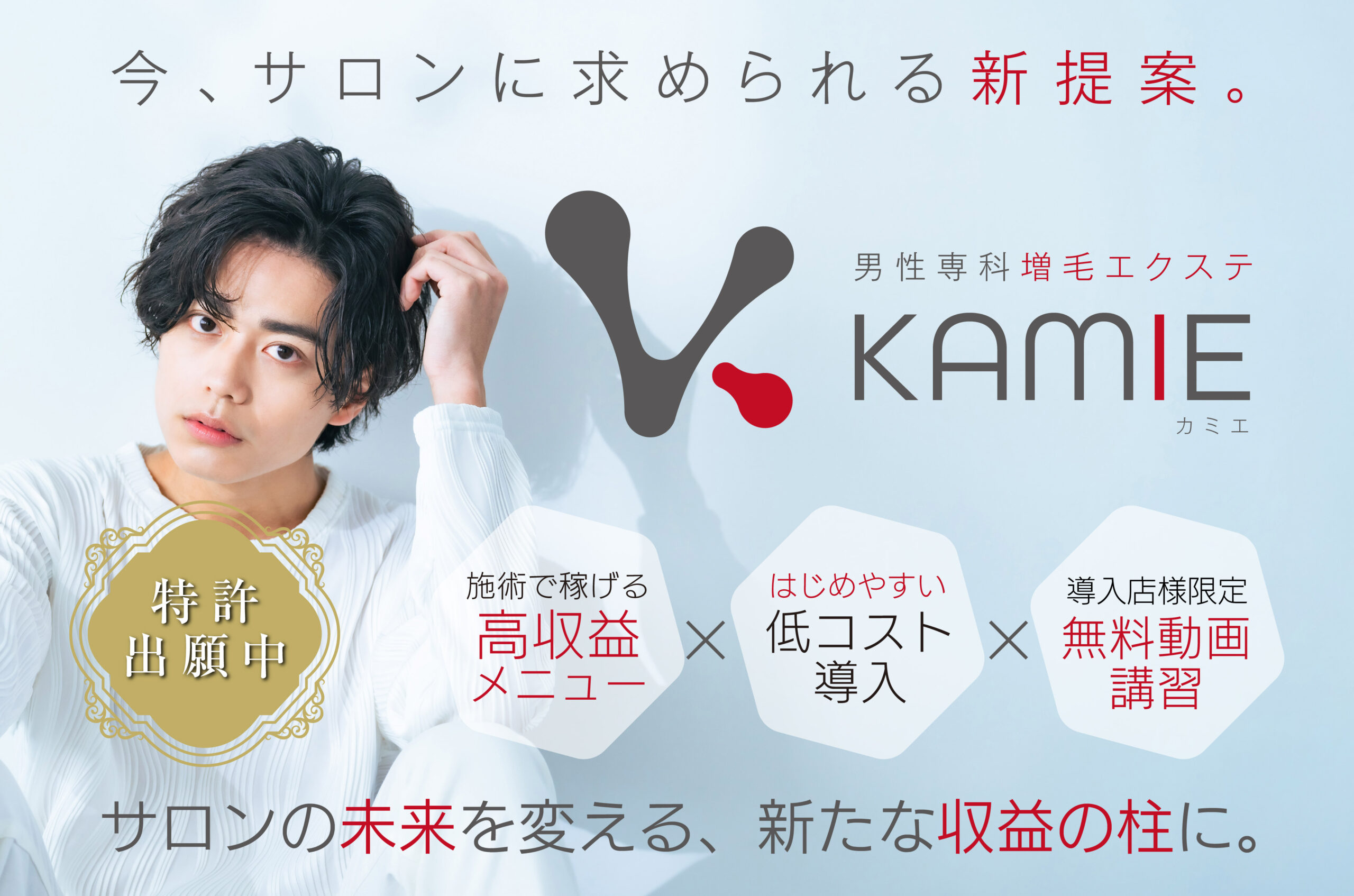 KAMIE(カミエ)は、男性専用に開発された日本製ニューファイバーを採用した、まったく新しいメンズ専科エクステブランド。自然で清潔感があり、若い男性のファッション層から薄毛に悩む層まで幅広く対応。まだ市場にほとんど出回っていないこの技術で、他店と差がつく“新メニュー”を今すぐ導入できます。